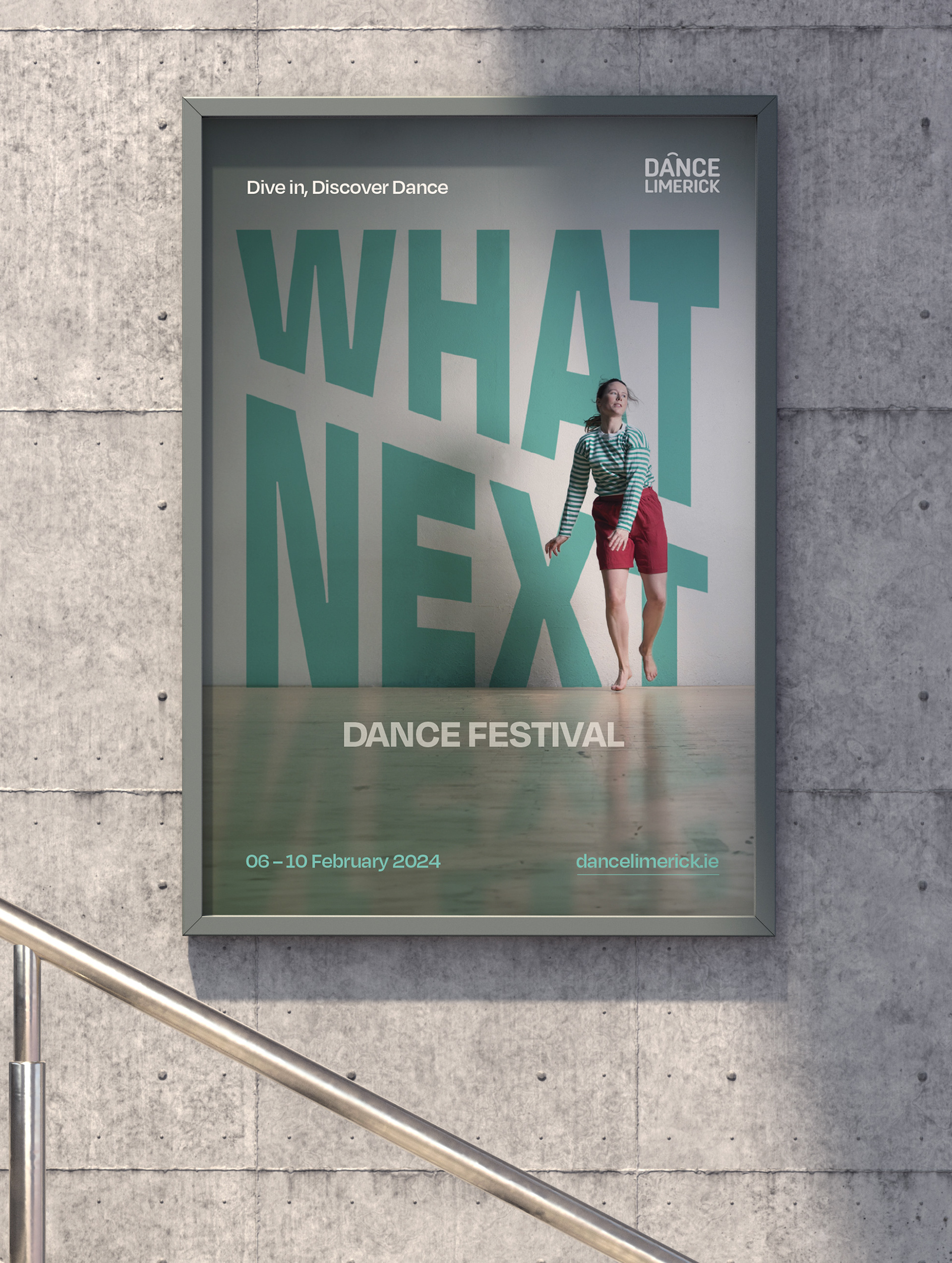Following on from the redesign of the festival identity in 2023, the 2024 edition continued on the idea of integrating the festival title with production photography. This year, the title featured as a backdrop to the performer's movement and became part of the scene in a rehearsal room. AI was used to extend the wall and floor in the original image allowing for a greater area to display the type and more room to play with for the animation.
